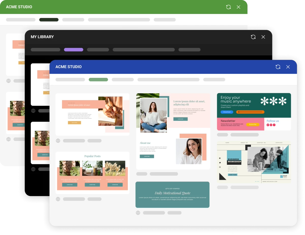 Curate, organize, and access your templates in a clean, white-labeled editor experience. Share your library across any website and build faster, more consistent projects.